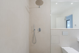 Badezimmer: luxuriös mit ebenerdiger Dusche, Glasverkleidung und großem Spiegel