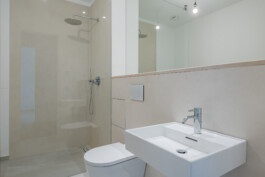 luxuriös mit ebenerdiger Dusche, Glasverkleidung und großem Spiegel